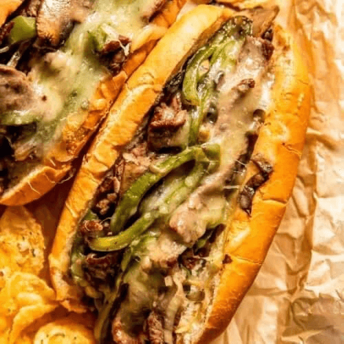 Thinly sliced beef with melted cheese in a sandwich. Half or whole size options available