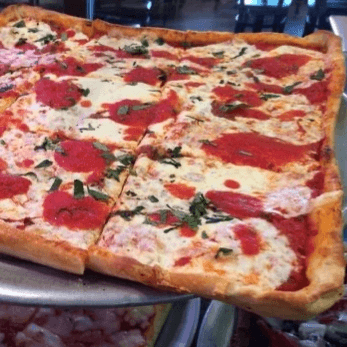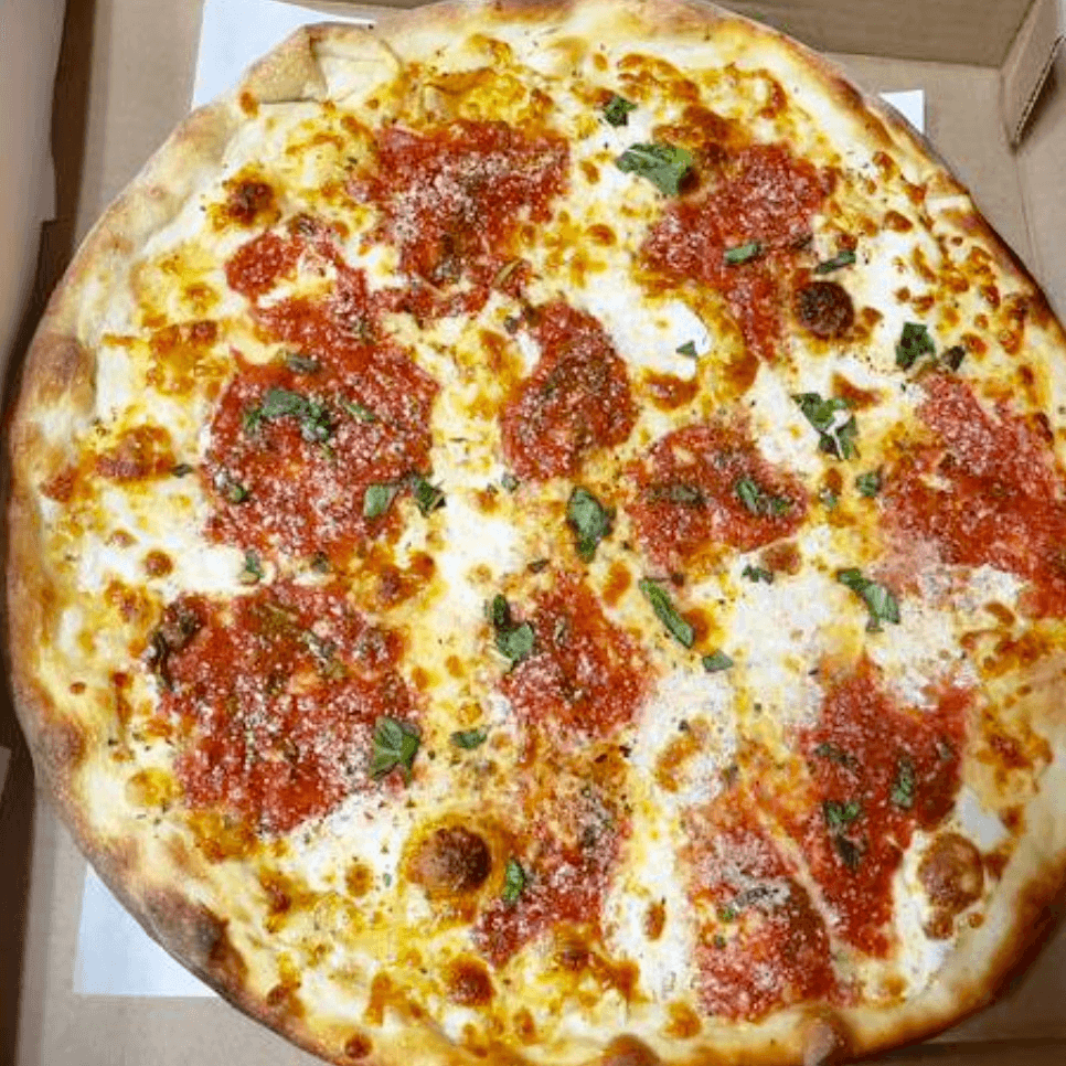 San marzano tomato sauce, parmesan cheese, and extra virgin olive oil, garnished with fresh basil on a thin Sicilian crust like Nonna used to make!