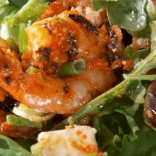Shrimp, mixed greens, grape tomatoes, red onions, and a light balsamic vinegrette dressing