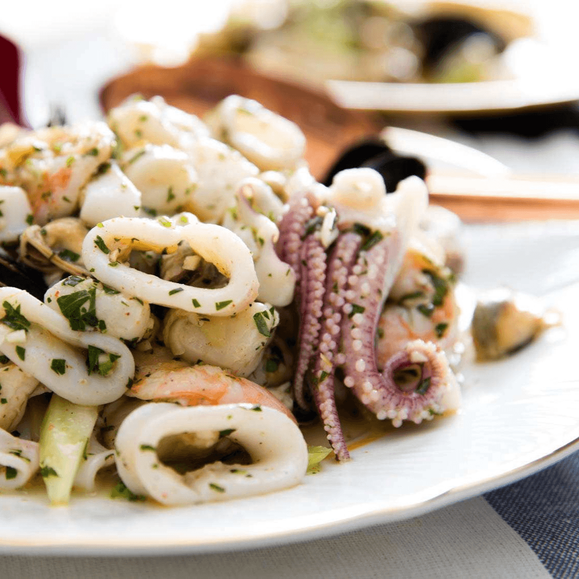 Linguine sautéed with shrimp, calamari, and clams in a garlic and extra virgin olive oil sauce