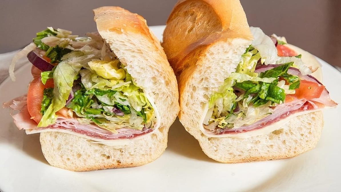 Ham, salami, capicolla, provolone, lettuce, tomato, and onion with oil and vinegar on italian bread. Available as whole or half