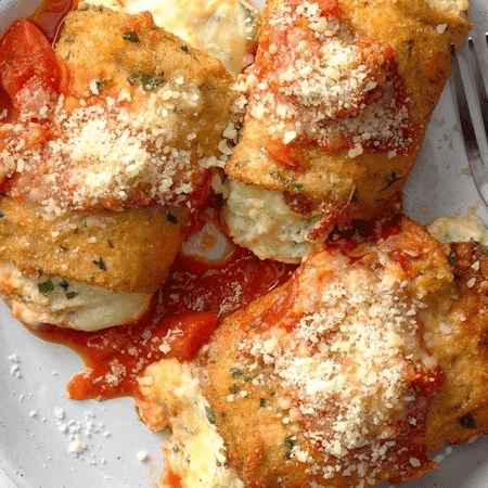 Layers of eggplant, tomato sauce, and melted cheese. Options: whole or half