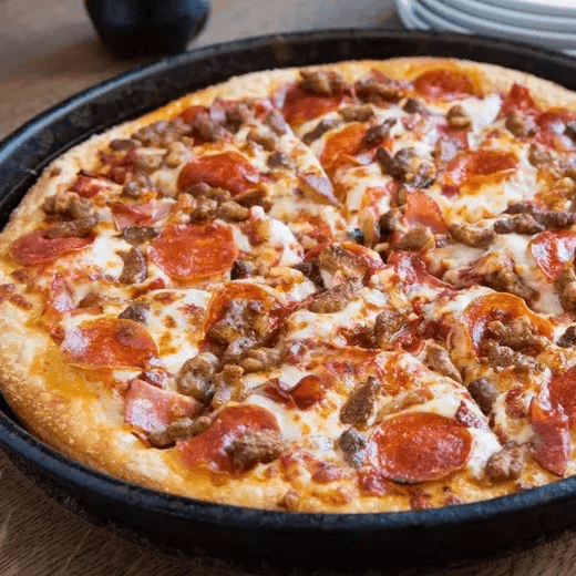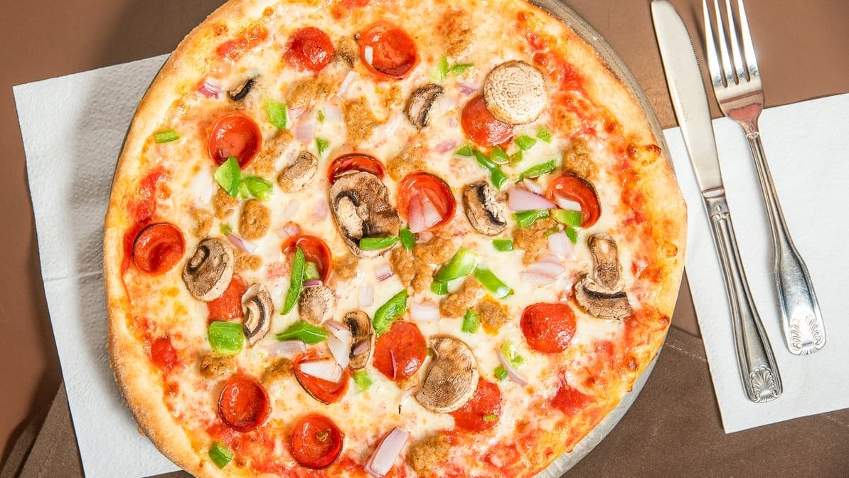 Topped with pepperoni, mushrooms, green peppers, onions, and sausage. Available in large or personal size